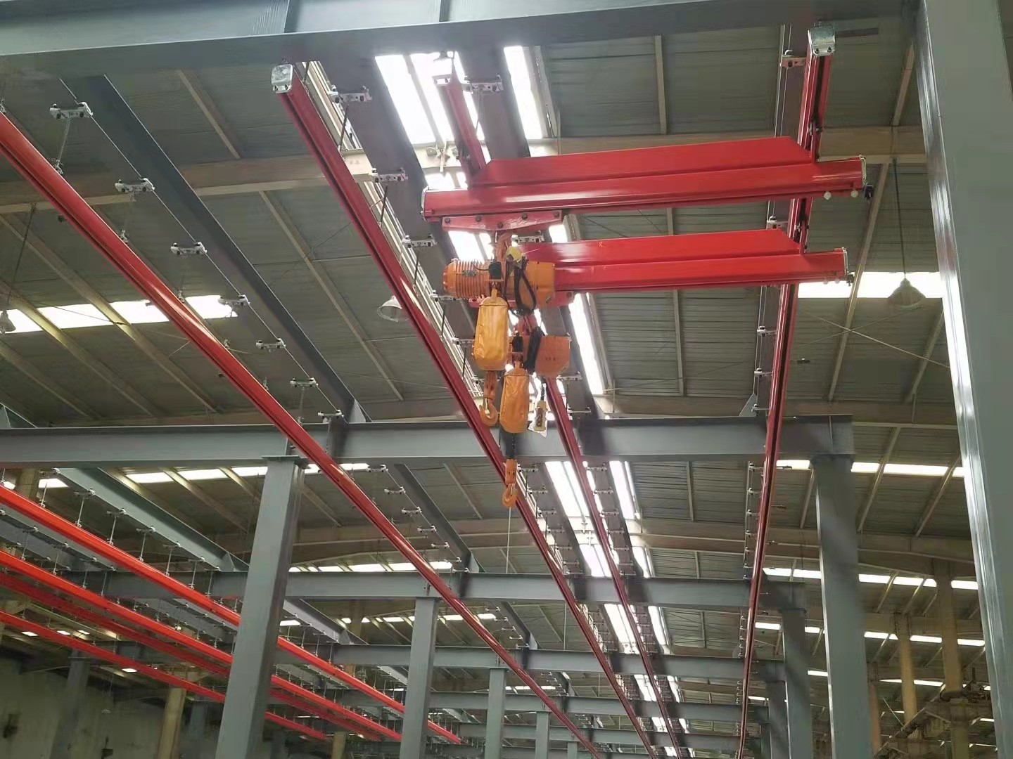 KBK起重機標(biāo)準(zhǔn)組件。由懸掛裝置、軌道、道岔、行走小車、電動葫蘆、移動供電裝置(滑線)以及控制裝置等組件組合而成,起升裝置主要采用環(huán)鏈電動葫蘆,也可吊掛一些機械手或焊槍之類,作為工具滑軌使用,起重量一般不超2000kg。