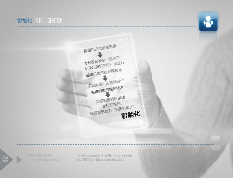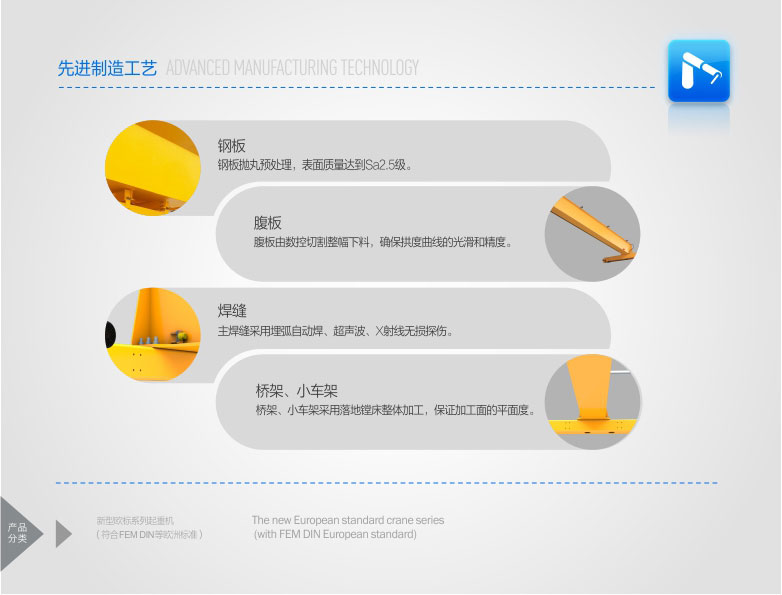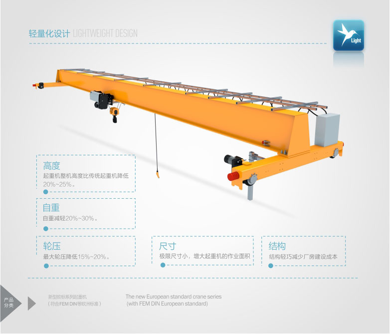 2、   該產(chǎn)品技術(shù)先進,設(shè)計按照國際標(biāo)準(zhǔn):DIN(德國)、FEM(歐洲)、ISO(國際),具有剛性強、自重輕、結(jié)構(gòu)設(shè)計出眾等優(yōu)點,能有效地節(jié)約廠房空間和投資成本,行走結(jié)構(gòu)特點獨特。