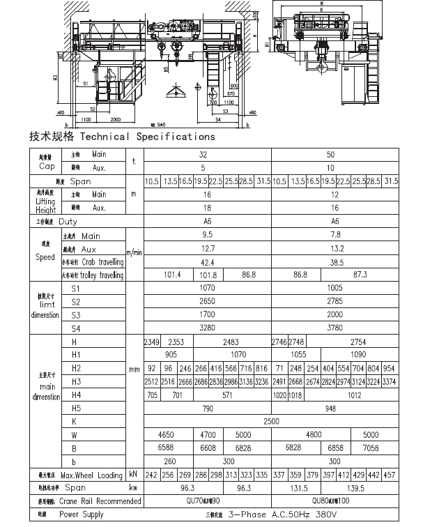 二、產(chǎn)品簡圖及技術(shù)規(guī)格(QC32/5-50/10t)